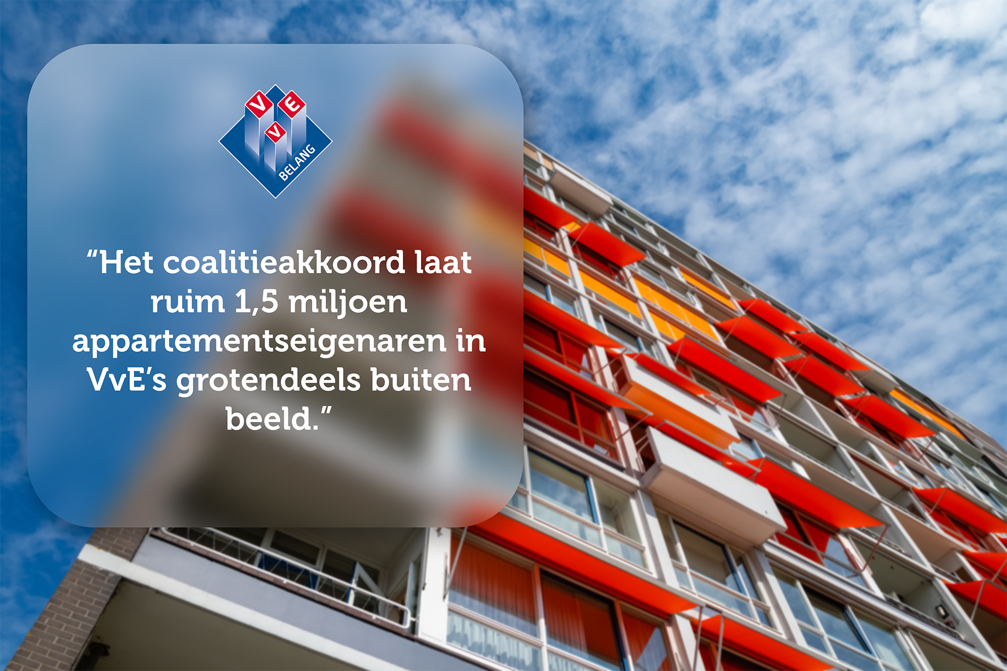 VvE Belang ziet het als gemiste kans dat het coalitieakkoord de verschillende onderwerpen afzonderlijk benaderd en niet een samenhangende visie lijkt te hebben op de problemen en oplossingen waar VvE’s toe worden uitgedaagd, terwijl juist bij VvE’s een groot deel van de bestaande woningvoorraad ligt.
